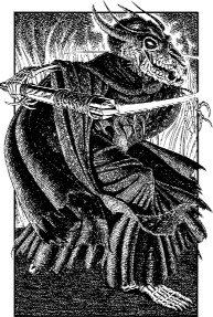 Ixiataaga is a tall creature with a goat-like skull. In his eye sockets are fiery cores of scarlet energy and he reeks of the stench of death and corruption.