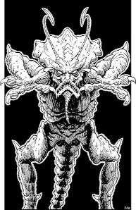Shom'zaa is a four legged dragon that has a triangular head and two pale green radiant eyes set above a three cornered mouth filled with crystalline teeth. Below its jaw protrudes a slender proboscis, from its crown of bony skull sprout antenna tipped with barbed spikes and slime drips from every pore. It injects fluid into the egg from the proboscis to encourage them to hatch.[1]